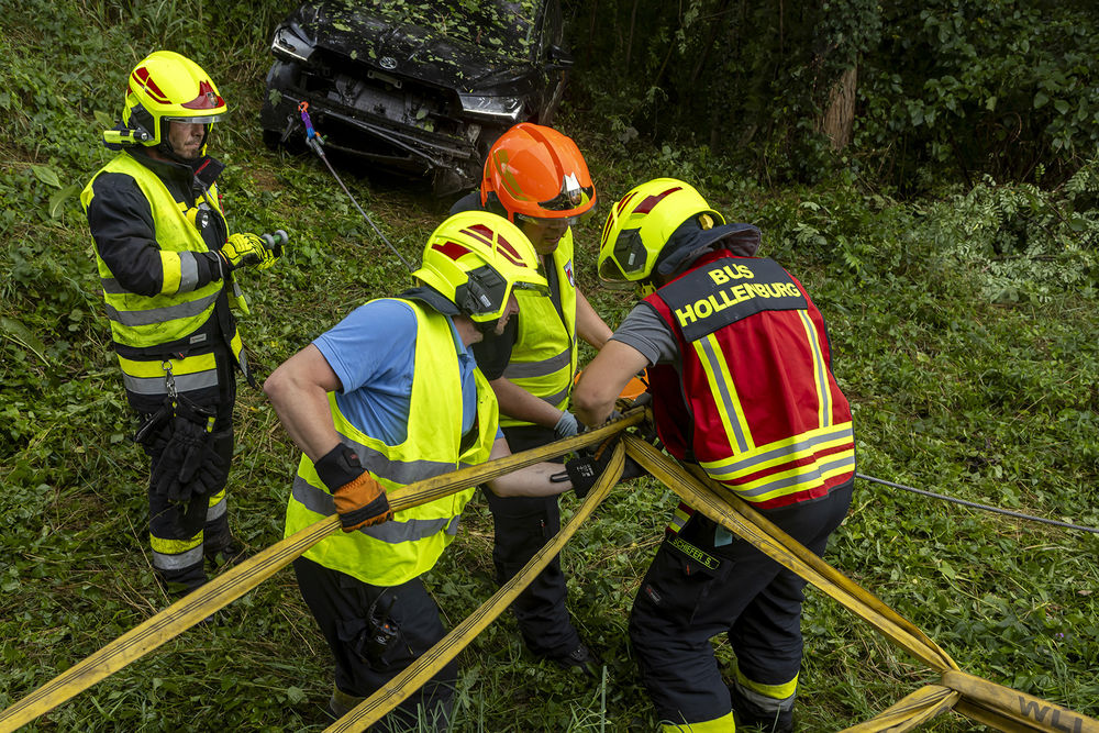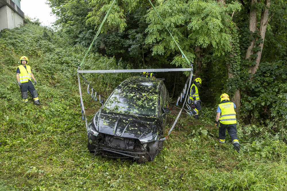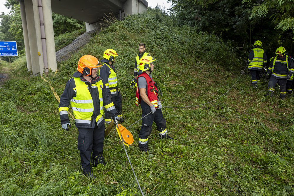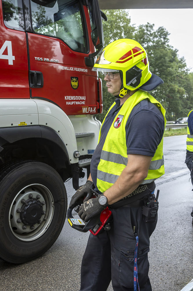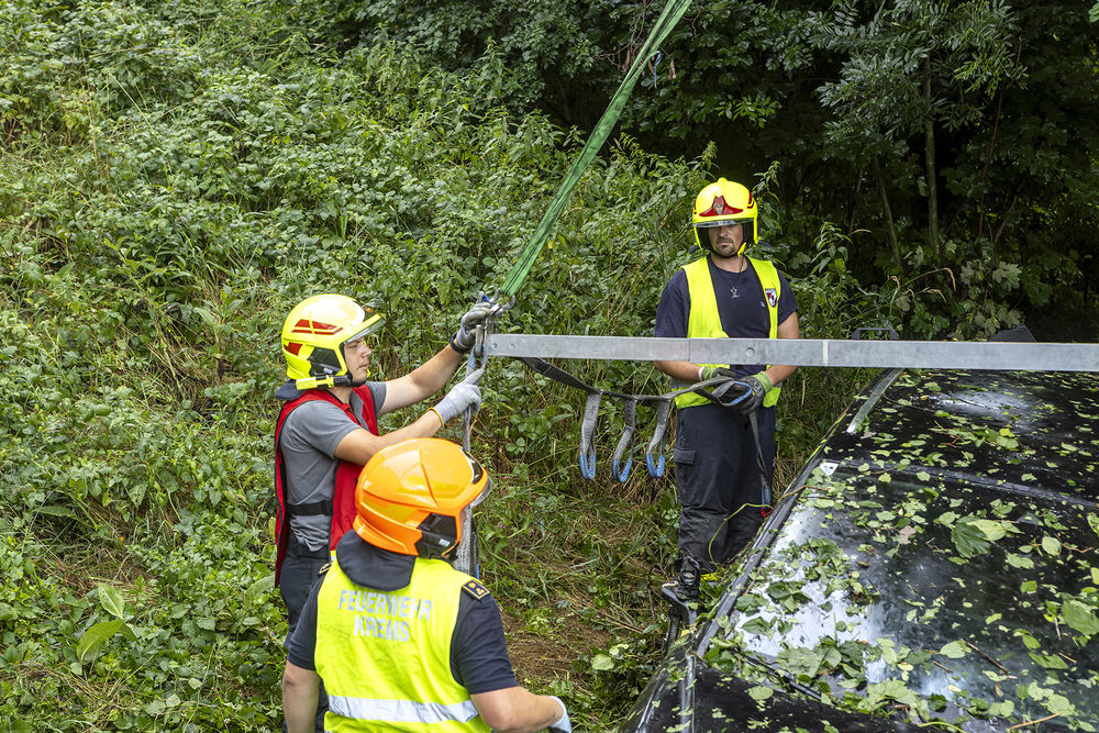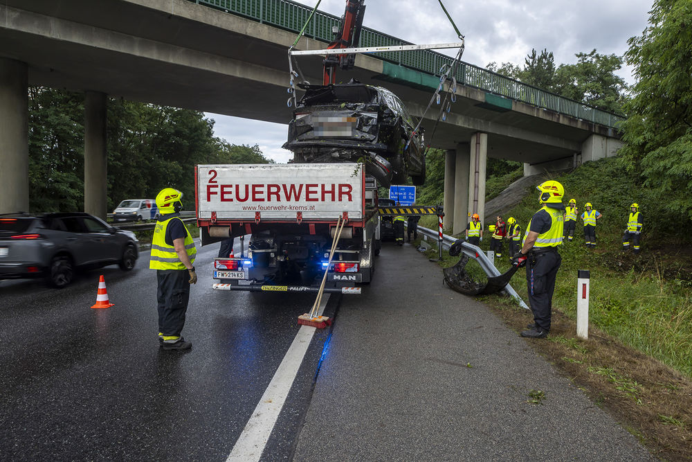 Beim Eintreffen der Feuerwehr sicherte die Autobahnpolizei die Unfallstelle ab. Für die Bergung des Wracks mussten zunächst die Sträucher weggeschnitten werden. Anschließend wurde das Fahrzeug mittels der Seilwinde von „Tank 7 Krems“ über eine Umlenkrolle ins Freie gezogen. Dort hob das Wechselladefahrzeug mit Kran der Feuerwehr Krems das Unfallfahrzeug auf das Bergeplateau und brachte es zu einem gesicherten Abstellplatz.