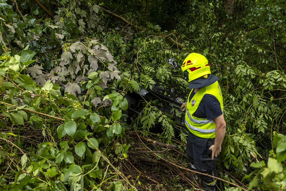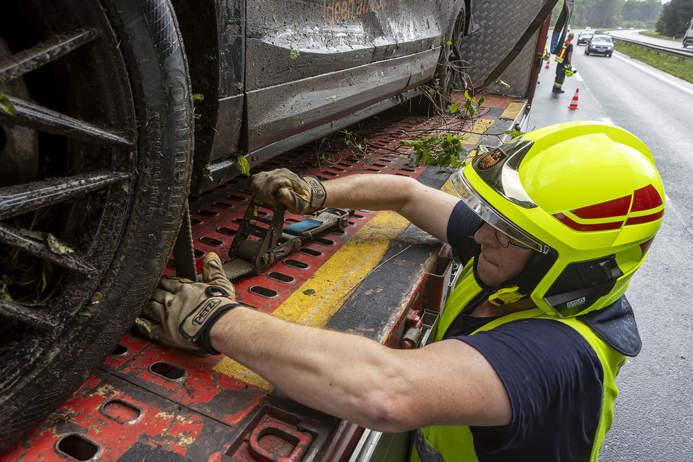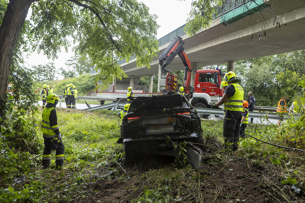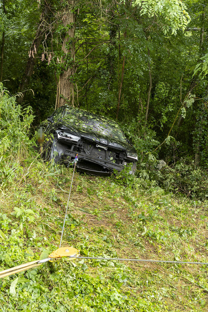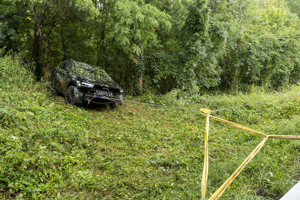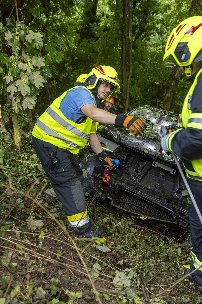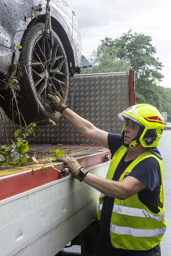 Beim Eintreffen der Feuerwehr sicherte die Autobahnpolizei die Unfallstelle ab. Für die Bergung des Wracks mussten zunächst die Sträucher weggeschnitten werden. Anschließend wurde das Fahrzeug mittels der Seilwinde von „Tank 7 Krems“ über eine Umlenkrolle ins Freie gezogen. Dort hob das Wechselladefahrzeug mit Kran der Feuerwehr Krems das Unfallfahrzeug auf das Bergeplateau und brachte es zu einem gesicherten Abstellplatz.