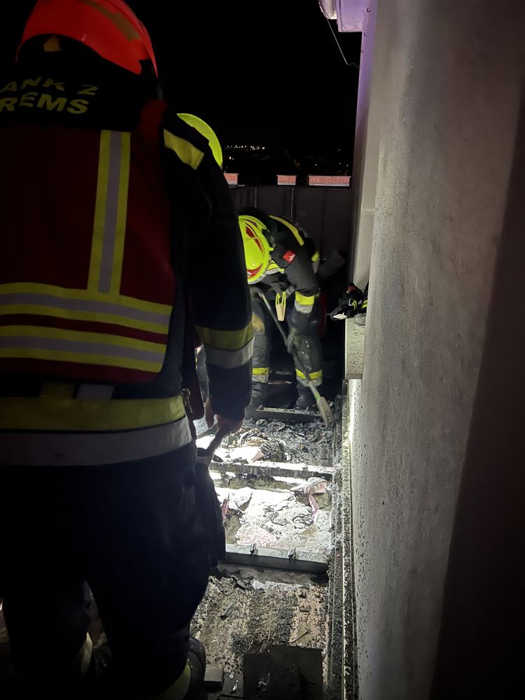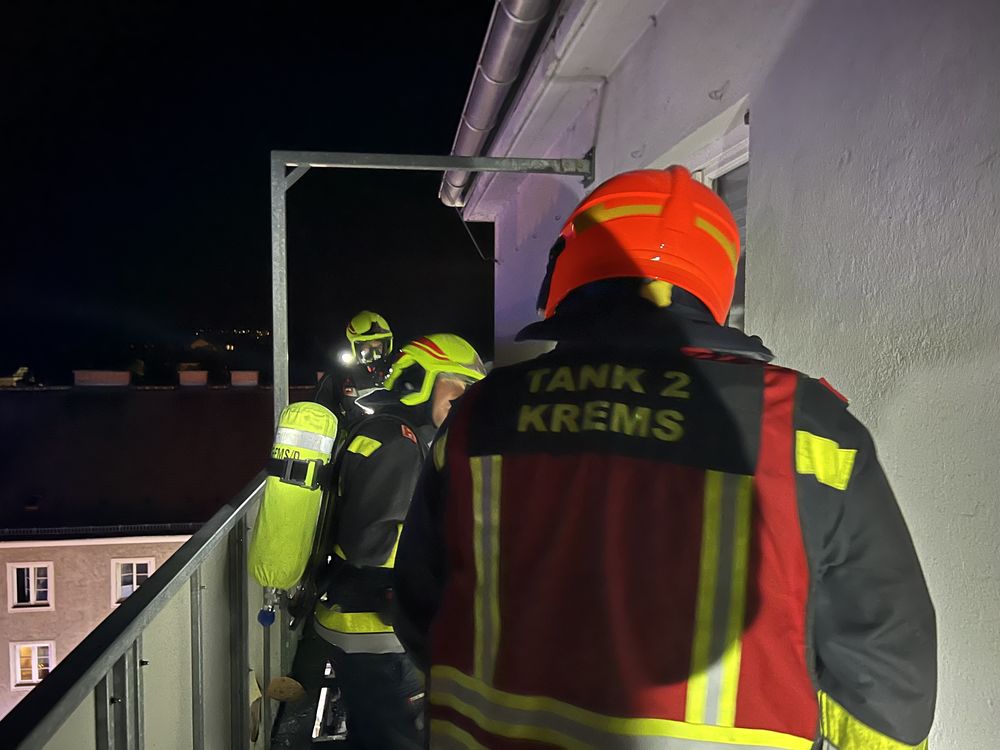 Beim Eintreffen des ersten Fahrzeugs am Einsatzort bauten die Einsatzkräfte unverzüglich nach dem Kremser Standardvorgehen die Löschleitung auf. Diese war binnen zweieinhalb Minuten bis in den obersten Stock verlegt. Der Fahrzeugkommandant begab sich mit seinem Atemschutztrupp in das 5. Obergeschoss. Beim Betreten des Balkons stand dieser auf einer Fläche von etwa drei Quadratmetern in Flammen. Da der Wohnungsbesitzer bereits Löschversuche mittels Feuerlöscher versuchte, setzten die Einsatzkräfte die Löscharbeiten unverzüglich fort. Unter Atemschutz löschte der erste Trupp den Brandherd mithilfe eines Schaumlöschers ab. Der Brand war rasch unter Kontrolle. Durch das Agieren mittels Feuerlöscher konnte ein größerer Wasserschaden verhindert werden.