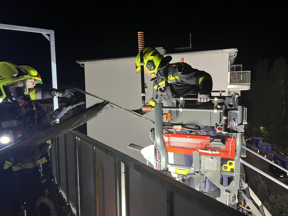 Mithilfe der Schuttmulde der Drehleiter wurde das verbrannte Holz zügig abtransportiert. Nach einer weiteren Kontrolle mit der Wärmebildkamera konnte mit dem Abbau begonnen werden. Während die Gerätschaften zurückgebaut wurden, konnten die Holzbodenteile erneut nachgelöscht werden.