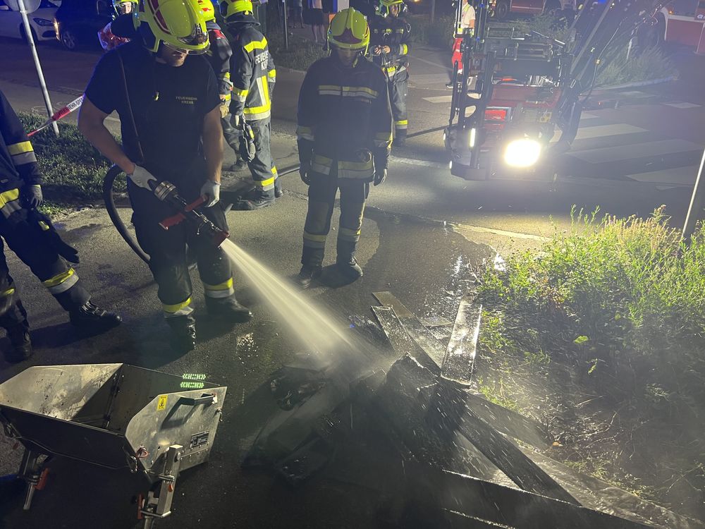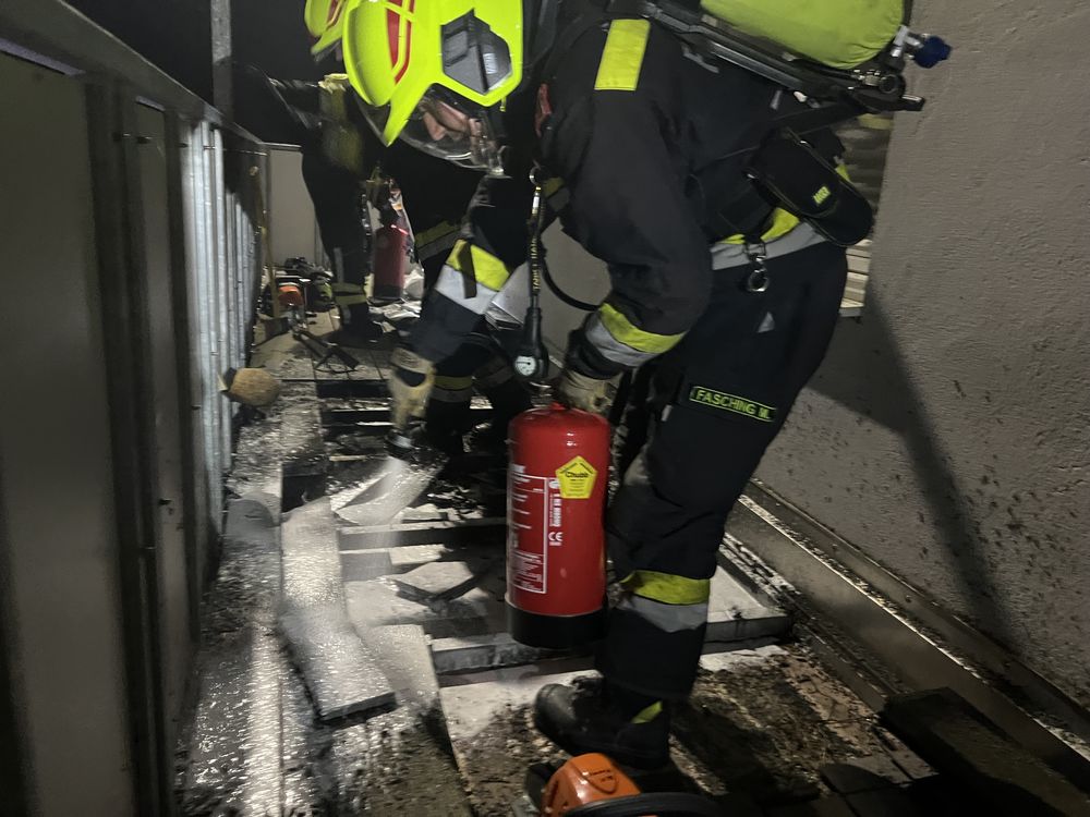 Mit einer Motorkettensäge öffneten die Einsatzkräfte den Boden und die Dämmung und kontrollierten auf versteckte Glutnester. Nachdem diese abgelöscht waren, wurde zusätzlich die Fassade überprüft – es konnten keine Brandspuren festgestellt werden.