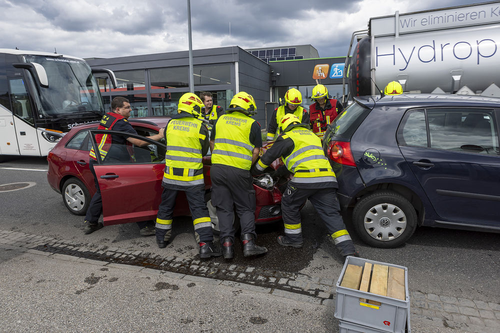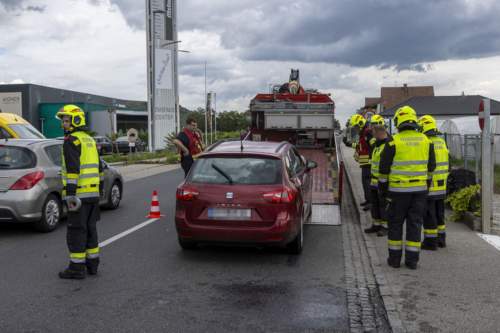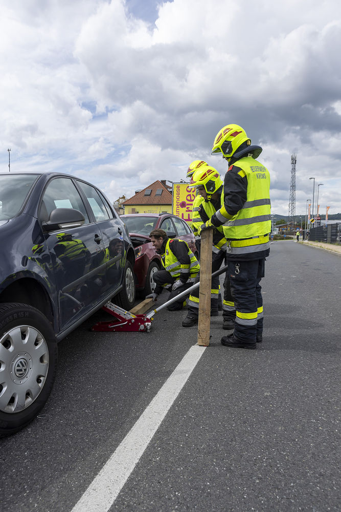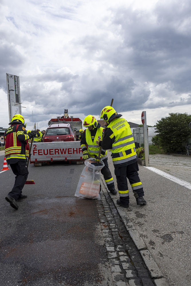 Beim Eintreffen der Feuerwehr wurden die beiden Fahrern bereits von zwei Rettungswagen des Roten Kreuzes Krems versorgt. Nach Freigabe durch die Polizei begannen die Einsatzkräfte mit der Bergung der Fahrzeuge. Da die beiden PKW ineinander verkeilt waren, musste das vordere Fahrzeug zunächst angehoben werden. Nachdem die Fahrzeuge getrennt waren, konnte das erste Fahrzeug an die Seite gestellt werden. Das zweite Fahrzeug wurde mithilfe des Wechselladefahrzeugs mit Kran aufgeladen und an einem gesicherten Abstellplatz abgestellt. Nachdem die ausgelaufenen Betriebsmittel gebunden waren, rückten die Einsatzkräfte in die Zentrale ein.