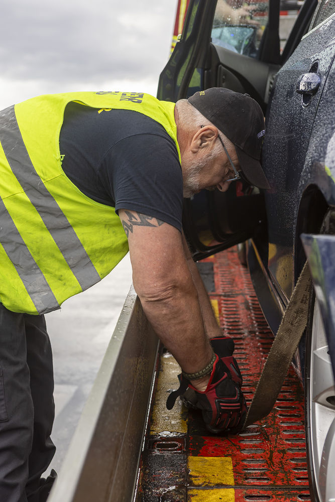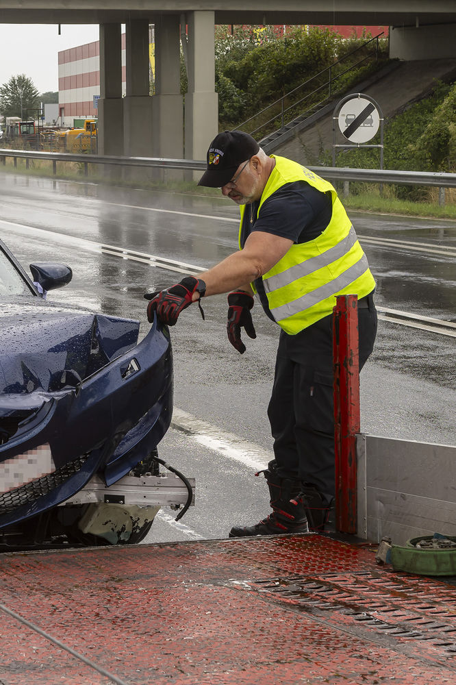 Die Hausmannschaft, die bereits nach wenigen Minuten vor Ort war, sicherte die Unfallstelle ab und begann mit der Bergung des Wracks. Mittels der Seilwinde des Bergeplateaus konnte das Fahrzeug auf das Plateau gezogen werden, um es anschließend zu einem gesicherten Abstellplatz zu bringen.