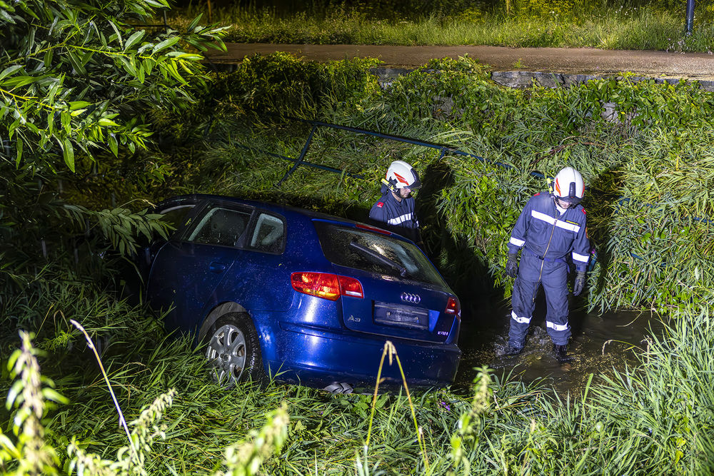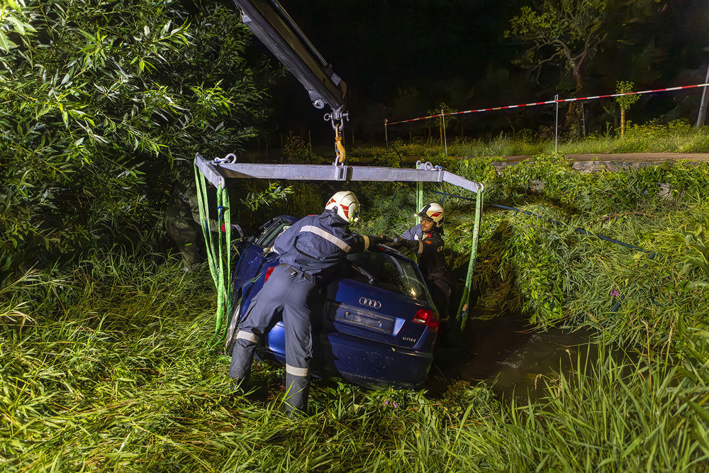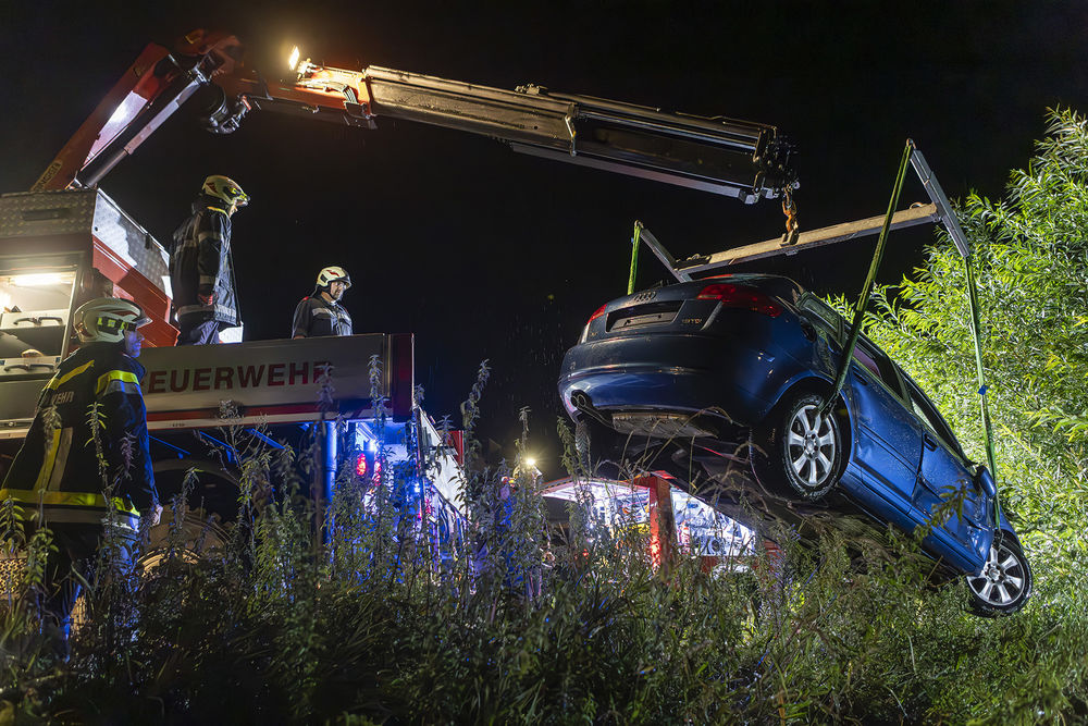 Beim Eintreffen der ersten Feuerwehrkräfte konnte jedoch schnell Entwarnung gegeben werden: Es befand sich niemand mehr im Fahrzeug. Während sich der Rettungsdienst um den Unfalllenker kümmerte, wurde nach der Freigabe der Unfallstelle durch die Polizei die Bergung des Pkws vorbereitet. Das Vorausfahrzeug mit Kran der FF Spitz wurde in Stellung gebracht. Mittels Kran und Hebekreuz wurde der Pkw an den Rädern angeschlagen und vorsichtig aus dem Bachbett gehoben.