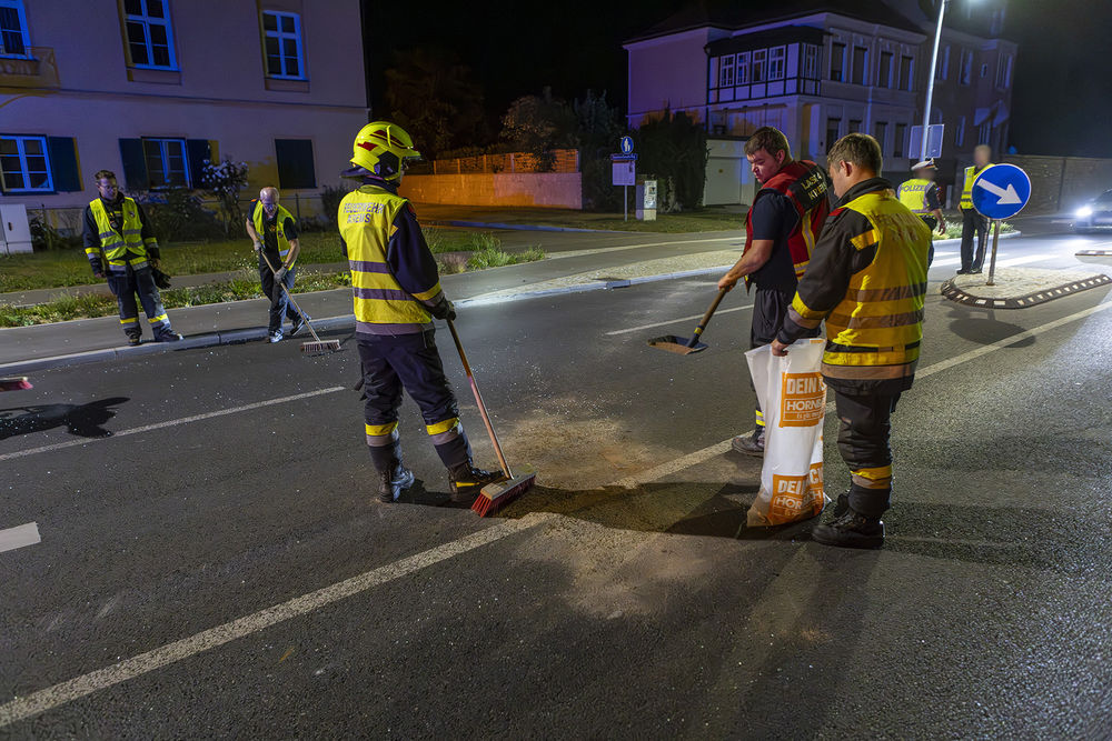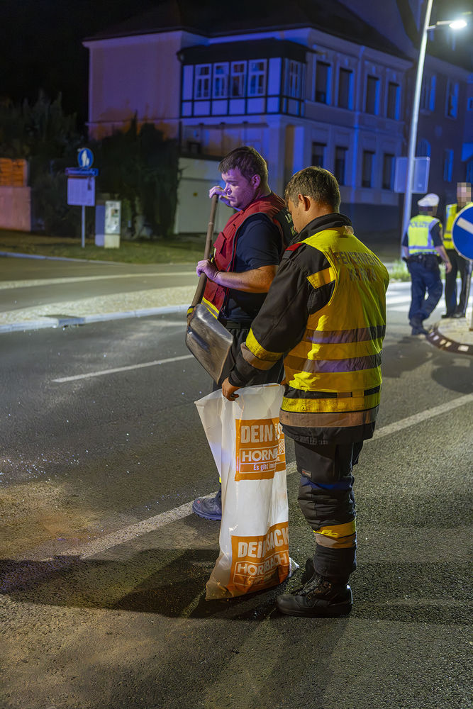 Beim Eintreffen der Feuerwehr am Einsatzort war die Unfallstelle bereits durch die Polizei abgesichert worden. Nach Freigabe durch die Beamten konnte mit der Bergung der Fahrzeuge begonnen werden. Der Rettungswagen wurde von einer privaten Abschleppfirma abgeholt. Der beschädigte Audi wurde in Teamarbeit auf den benachbarten Parkplatz gerollt und dem Besitzer übergeben. Nachdem die Betriebsmittel gebunden waren und der Straßenerhalter informiert worden war, damit dieser zur Warnung der anderen Verkehrsteilnehmer Hinweistafeln aufstellen konnte, konnten die Einsatzkräfte abrücken.