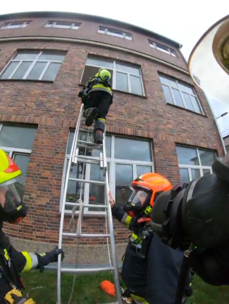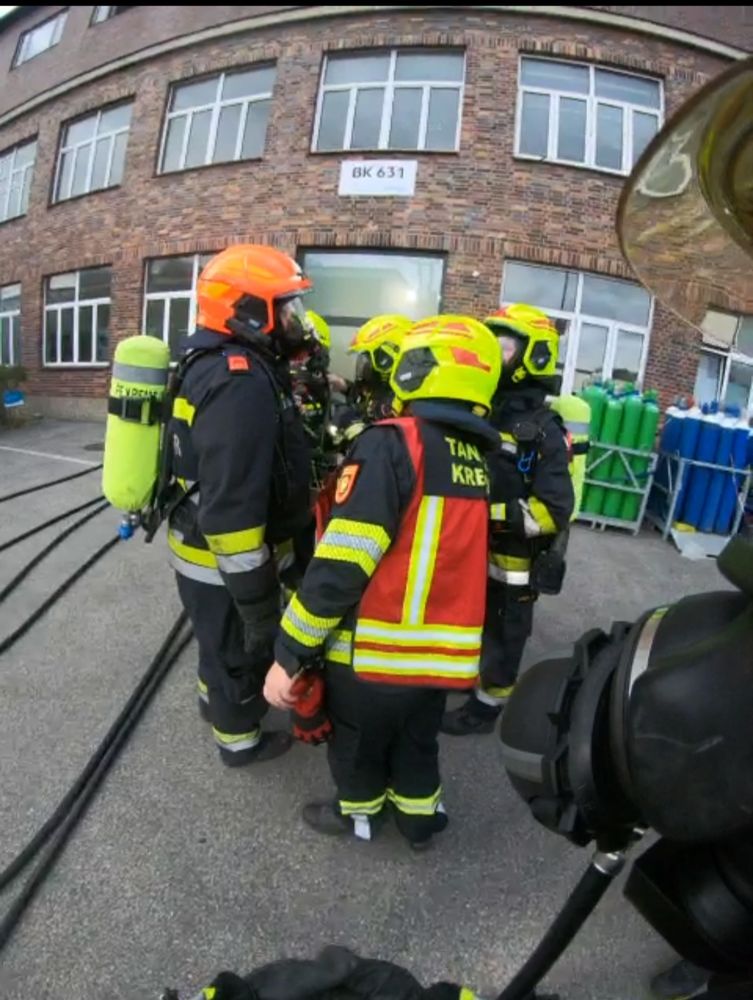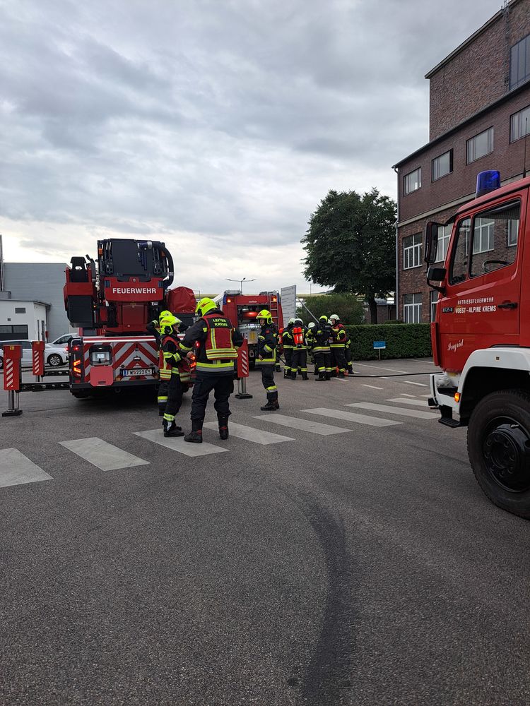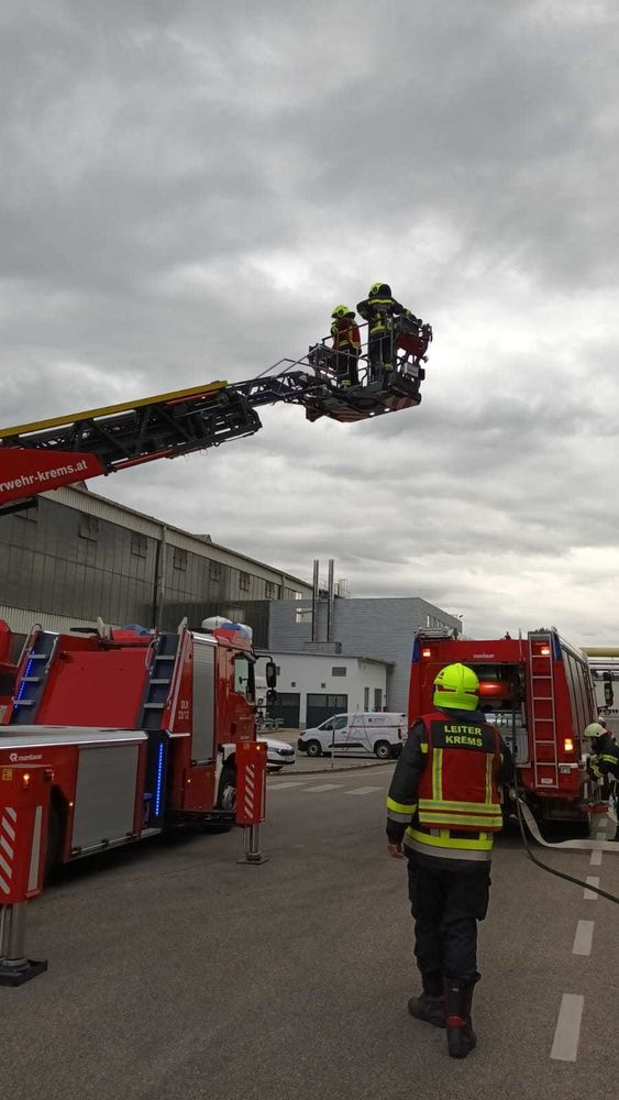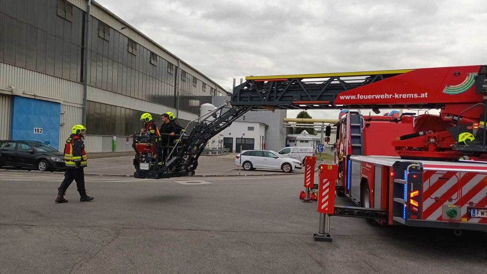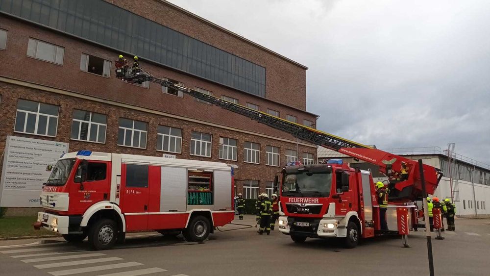 Die Feuerwehr Krems rückte mit zwei Fahrzeugen, einem Tanklöschfahrzeug und einer Drehleiter, sowie insgesamt 9 Kräften zur Übung aus. Am Werksgelände angekommen wurden die Fahrzeuge durch einen Einweiser der Betriebsfeuerwehr voestalpine Krems zum Einsatzort eingewiesen. Beim Eintreffen beim Gebäude begab sich der Fahrzeugkommandant unmittelbar zum Einsatzleiter, um die Lagebesprechung sowie die Einteilung der weiteren Tätigkeiten vorzunehmen. Währendessen machten sich zwei vermisste Personen im zweiten Obergeschoss durch Winken aus einem Fenster auf sich aufmerksam, da der Fluchtweg, aber auch das Stiegenhaus, komplett verraucht war, konnten die Personen das Gebäude nicht mehr verlassen. Daraufhin wurde die Drehleiter in Position gebracht. Die beiden Personen konnten rasch und sicher über die Drehleiter aus ihrer Notlage gerettet werden. Eine weitere Person befand sich im ersten Obergeschoss. Hier kam die Schiebeleiter zum Einsatz. Ein gemischter Atemschutzrupp, bestehend aus Kräften der Feuerwehr Krems und einer Einsatzkraft der Betriebsfeuerwehr voestalpine Krems, führte die Rettung durch. Mit Unterstützung einer Rettungstrupptasche, ausgestattet mit Fluchthaube und speziellen Geräten für den Innenangriff, konnte die Person unter Atemschutz sicher ins Freie gebracht werden. Danach ging der Atemschutzrupp nochmals ins Gebäude vor um die anderen Räume durchzuschauen und markierte die Türen, damit andere Trupps wissen dass der Raum schon abgesucht worden ist.