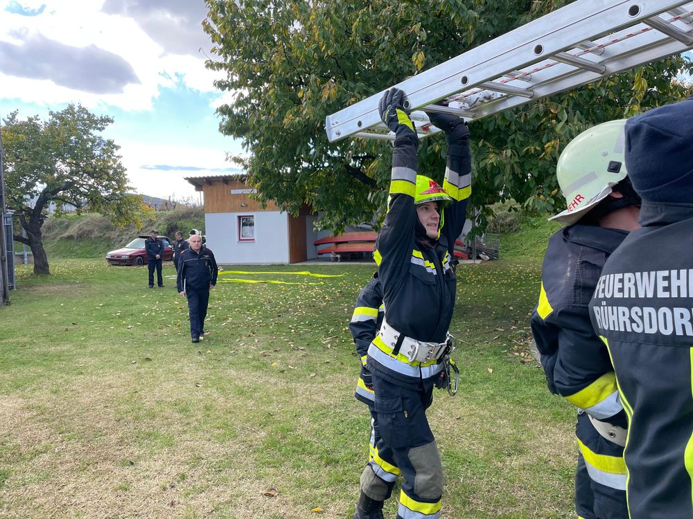 Aufgeteilt in eine theoretische sowie eine praktische Wissensüberprüfung wird hier das erlernte Feuerwehrwissen abgefragt. Souverän wusste Elias sowohl im Schulungsraum als auch bei der Praxisübung „Anleitern“ zu überzeugen.