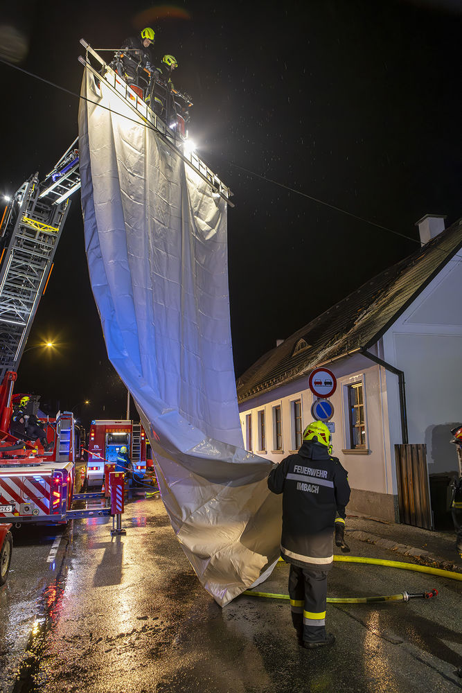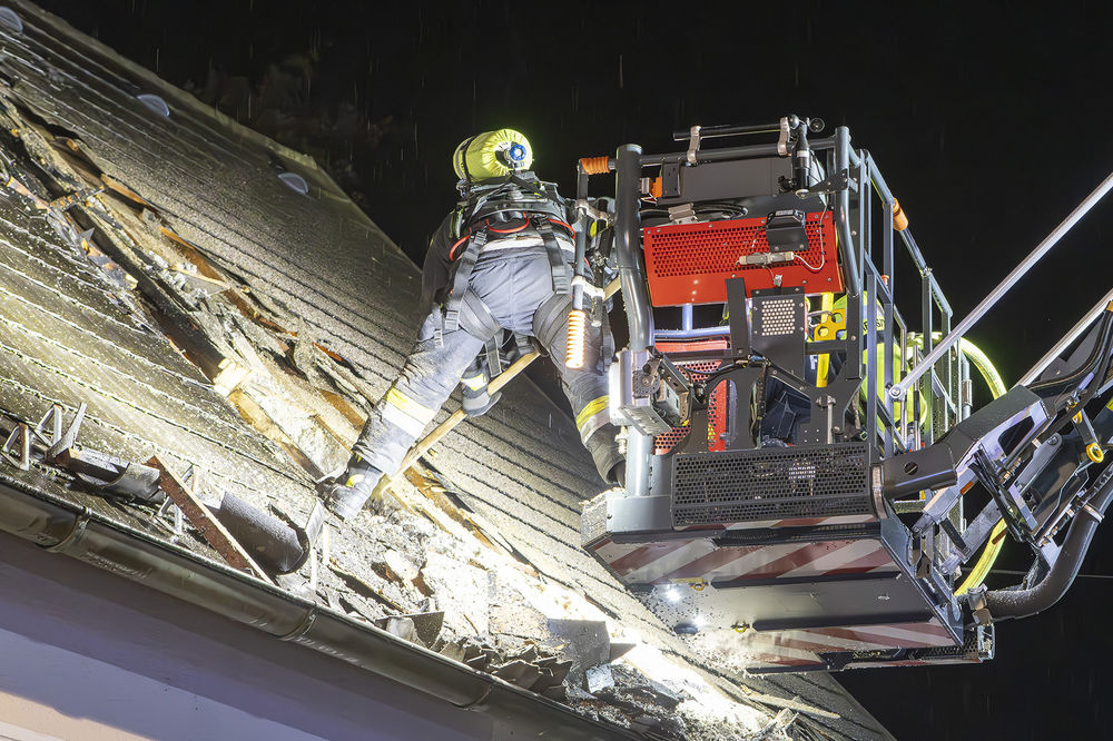 Da es sich um einen Brand im Dachaufbau in einem ausgebauten Dachstuhl handelte, versuchten die Einsatzkräfte von innen und auch von außen über die Drehleiter zur Brandstelle vorzudringen. Mittels Einreißhaken und mit Hilfe einer Motorkettensäge konnte das Dach geöffnet und der Brandherd aufgefunden werden. In koordinierten Schritten konnte gleichzeitig von beiden Seiten ein Durchbruch durchgeführt werden. Nachdem der Brand abgelöscht und das Dach auf Glutnester kontrolliert worden war, konnten die Aufräumarbeiten beginnen. Mittels einer Plane wurde der offene Teil des Daches abgedeckt.