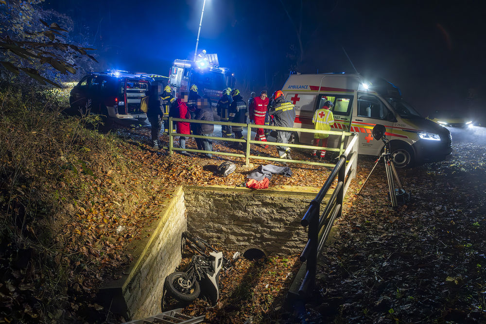 Am Donnerstagabend, dem 13. November 2025, wurden vier Feuerwehren zu einer technischen Menschenrettung nach Senftenberg alarmiert. Ein Motorradfahrer kam in einer Kehre zu Sturz und fiel samt Motorrad in den angrenzenden Straßengraben.