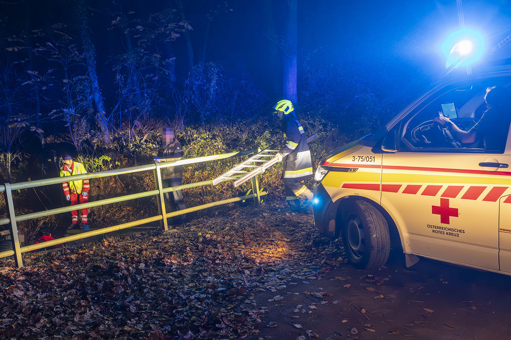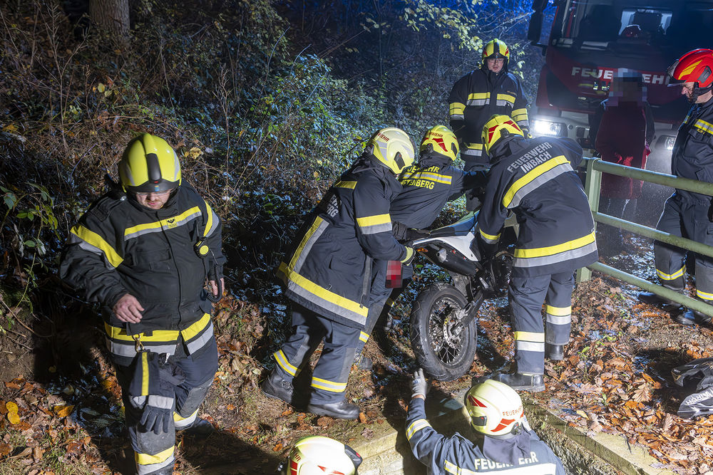Während die Feuerwehr eine Beleuchtung aufbaute, verschafften sich die Einsatzkräfte mittels Steckleitern einen Zugang zum Verletzten. Nachdem das Rote Kreuz und der Notarzt den Patienten erstversorgt hatten, konnte dieser mittels Korbschleiftrage aus dem Wasserauffangbehälter gerettet werden. Anschließend wurde der Motorradfahrer auf die Krankentrage umgelagert und in den vorgeheizten Rettungswagen gebracht.