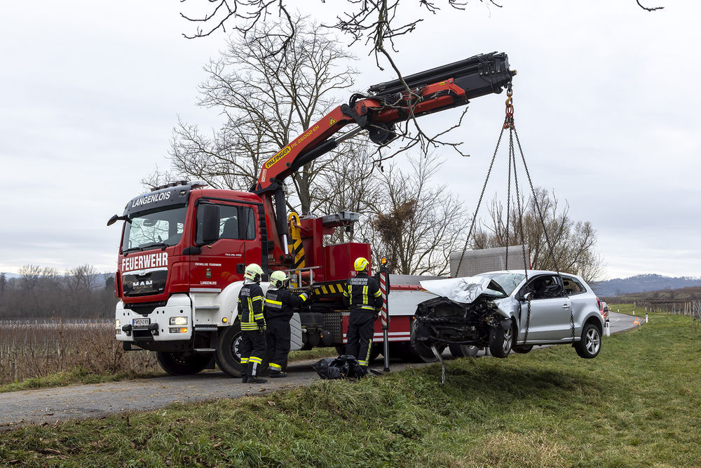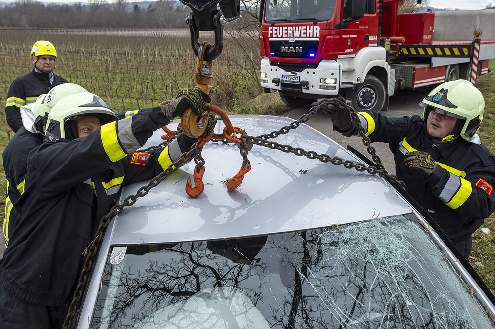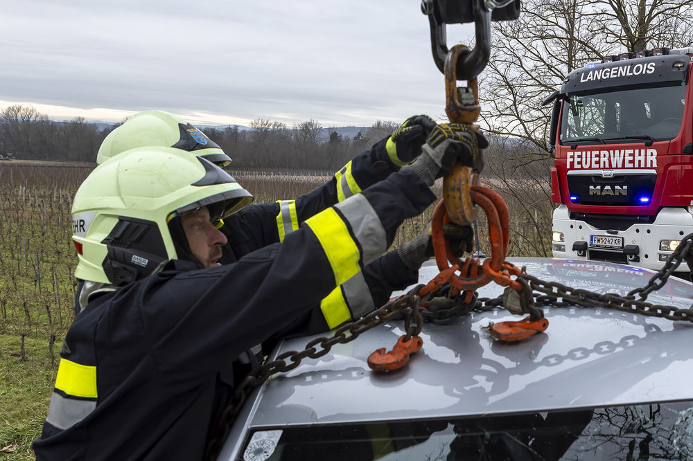 Nach der abgeschlossenen Unfallaufnahme durch die Polizei konnte mit der Bergung des Unfallfahrzeugs begonnen werden. Zur Bergung ließ der Einsatzleiter die Feuerwehr Langenlois mit ihrem Wechselladefahrzeug mit Kran nachalarmieren. In vereinten Kräften konnte das Unfallfahrzeug mittels des Krans geborgen werden.