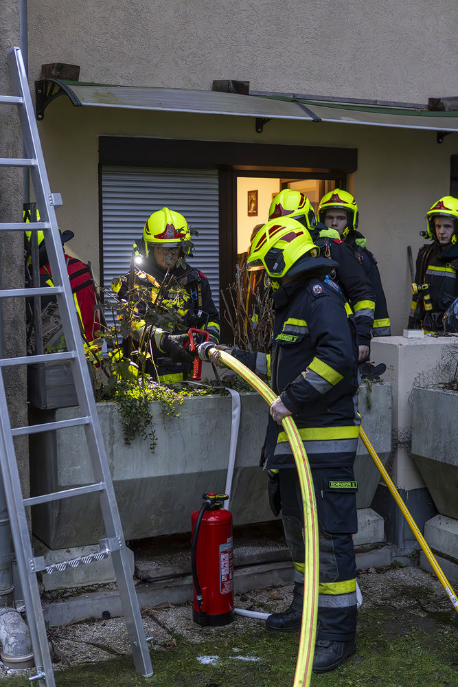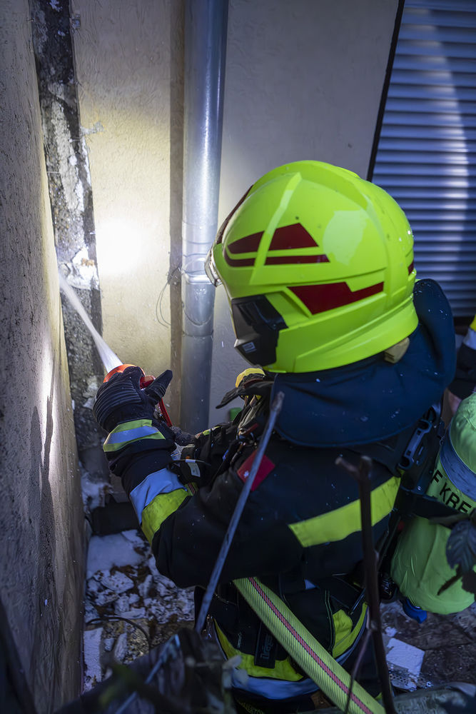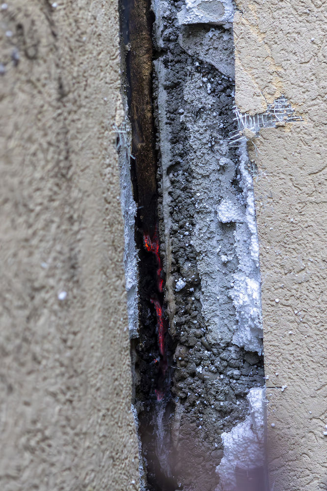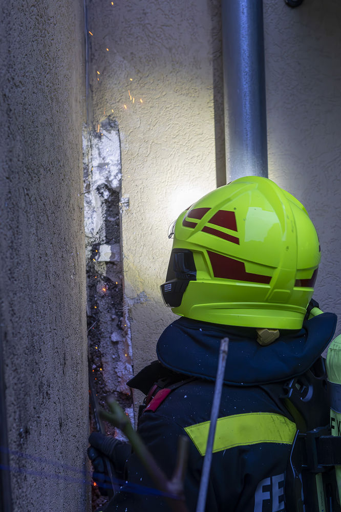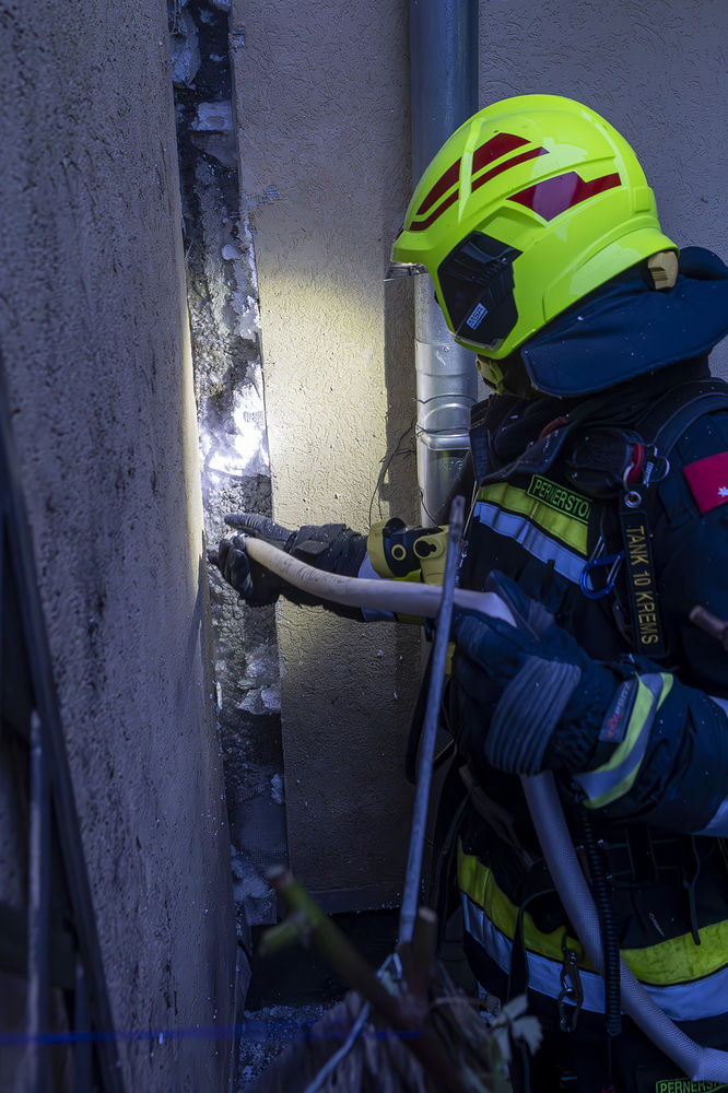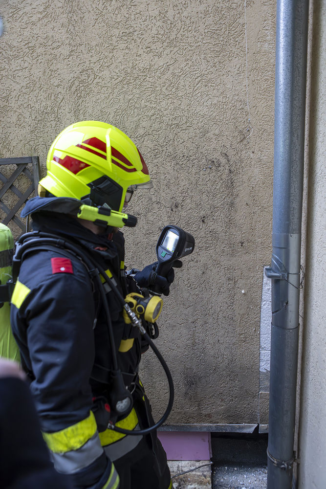 Bei der weiteren Erkundung durch den Einsatzleiter gingen die Einsatzkräfte auf den darunter liegenden Balkon vor. Mithilfe der Wärmebildkamera konnte rasch festgestellt werden, dass sich hinter der Fassade eine deutliche Erwärmung befand. Unverzüglich wurde die Fassade mittels Säbelsäge geöffnet und kontrolliert. Dabei fanden die Einsatzkräfte eine angebrannte und glosende Holzfaserdämmplatte vor. Diese wurde mithilfe der Löschleitung und der Kübelspritze abgelöscht.