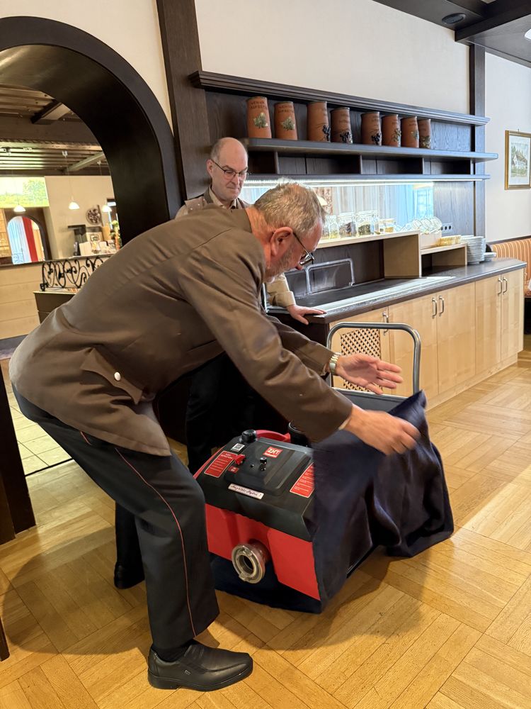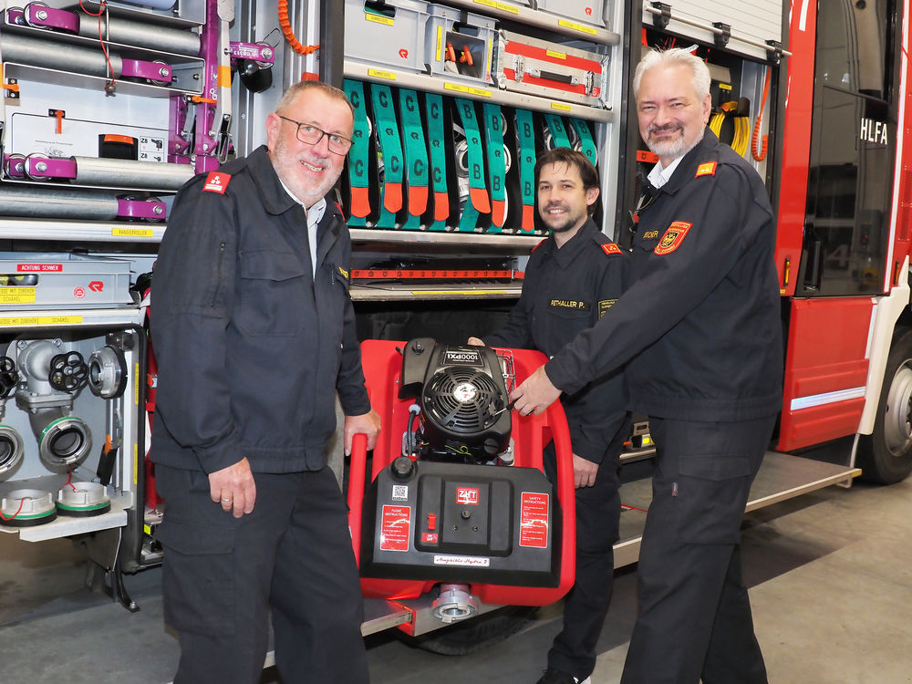 Nach den Gratulationen brachte Gerhard Burger einen verhüllten Gegenstand auf einem Transportwagen in den Festsaal. Er hat eine schwimmende Motorpumpe im Wert von rund 1500€ erstanden und übergab diese den Kameraden der Feuerwache Krems-Süd. Nach der feierlichen Enthüllung erläuterte er den Hintergund dieser Anschaffung.