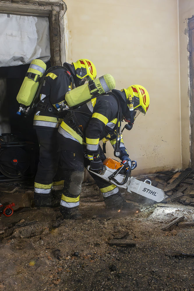Nach der Kontrolle und Belüftung des Raumes öffneten weitere Atemschutztrupps mittels Kettensäge den Boden und überprüften den Zwischenraum auf mögliche Glutnester. Eine Brandausbreitung konnte nicht festgestellt werden, weshalb „Brand aus“ gegeben werden konnte. Anschließend begann der Rückbau und die ersten Löschleitungen wurden abgebaut.