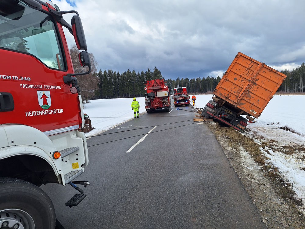Mithilfe der Seilwinde des Kranfahrzeuges wurde der Lastwagen zunächst wieder auf die Räder gestellt. Anschließend wurde der LKW mit zwei Seilwinden gleichzeitig – jener des Kranfahrzeuges sowie jener des Hilfeleistungsfahrzeuges der Feuerwehr Heidenreichstein – zurück auf die Fahrbahn gezogen. Gesichert wurde das Vorgehen zusätzlich durch die Seilwinde eines Traktors, sodass ein erneutes Umstürzen des LKWs verhindert werden konnte.