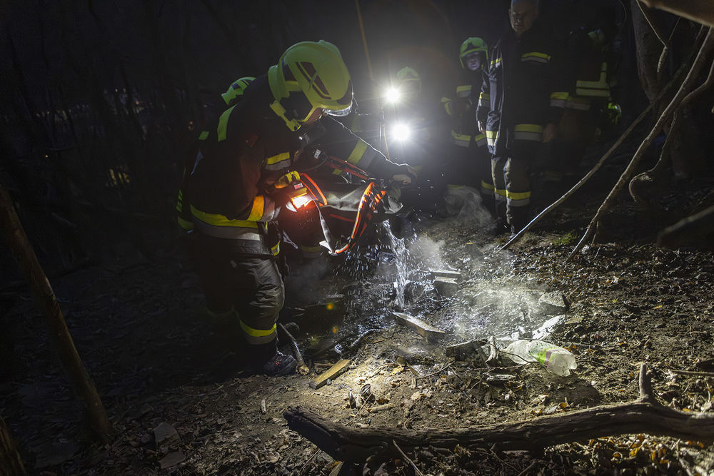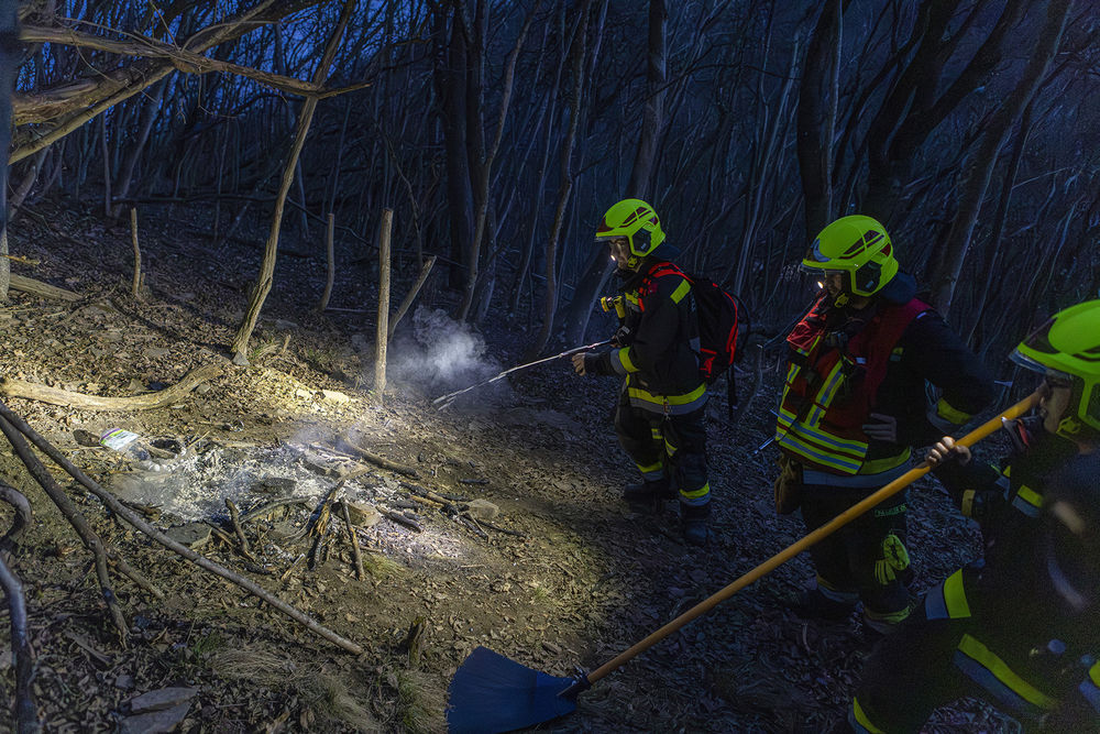 Während das Team anrückte, konnte ein Trupp ein Lagerfeuer mitten im Wald auffinden. Das Feuer war zu diesem Zeitpunkt bereits erloschen, jedoch war mittels Wärmebildkamera noch eine deutliche Wärmequelle erkennbar. Mithilfe eines Löschrucksacks konnte der Brandherd schließlich vollständig abgelöscht werden.