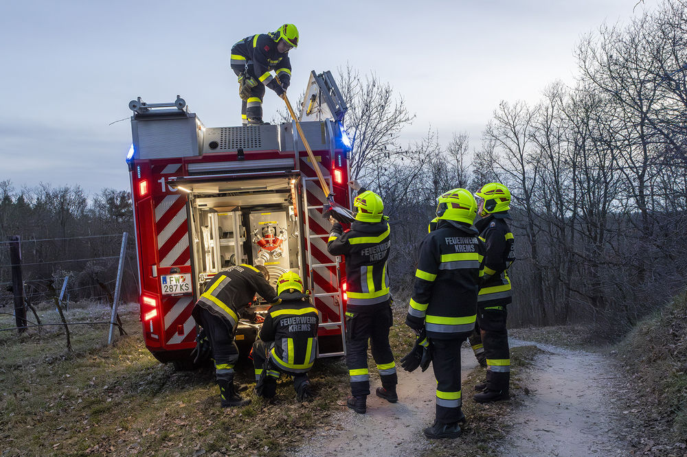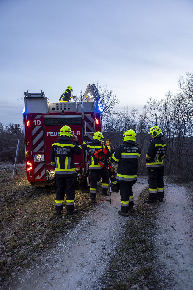Da beim Eintreffen der Feuerwehr nur noch eine leichte Rauchentwicklung wahrgenommen wurde, begannen die Einsatzkräfte mit der genauen Suche nach dem Brandherd. Da das betroffene Waldstück großflächig war und bereits die Dämmerung einsetzte, ließ der Einsatzleiter die Drohnengruppe der Feuerwehr Krems nachalarmieren.