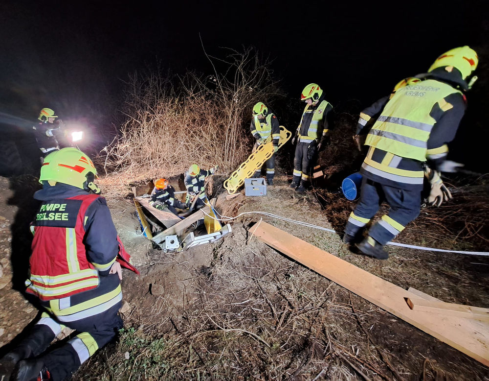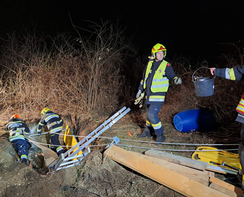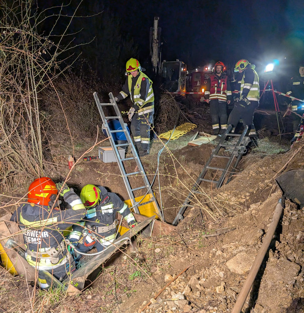 Die beiden Feuerwehrmänner, die in die Grube hinabstiegen, waren mit Feuerwehrgurten und Rettungsleinen gesichert, außerdem wurden mit Leitern zwei voneinander unabhängige Fluchtmöglichkeiten geschaffen. Nachdem die Grube und die Baggerschaufel gesichert waren, konnte der verschüttete Arbeiter freigeschaufelt und mit Bandschlingen aus der Grube gezogen werden.