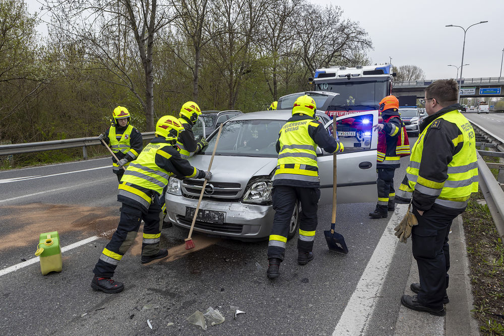 Der Auffahrunfall ereignete sich kurz vor 9.00 Uhr auf der Bundesstraße 3. Eine Lenkerin prallte mit ihrem Fahrzeug in das Heck eines anderen Autos. Die Frau blieb unverletzt, konnte ihre Fahrt aber nicht mehr fortsetzen. Die Front ihres Pkw war stark beschädigt, außerdem verlor das Fahrzeug Kühlflüssigkeit. Weil sich diese noch vor dem Eintreffen der Feuerwehr auf beide Fahrspuren ausgebreitet hatte, mussten die Einsatzkräfte der Hauptwache Krems Ölbindemittel aufbringen und die Fahrbahn abkehren. Die Bundesstraße 3 war während der Aufräumarbeiten in Fahrtrichtung Stein vollständig gesperrt - ein entsprechender Rückstau war die Folge. Die Insassen des zweiten Pkw blieben ebenfalls unverletzt. Sie konnten die Unfallstelle eigenständig verlassen.